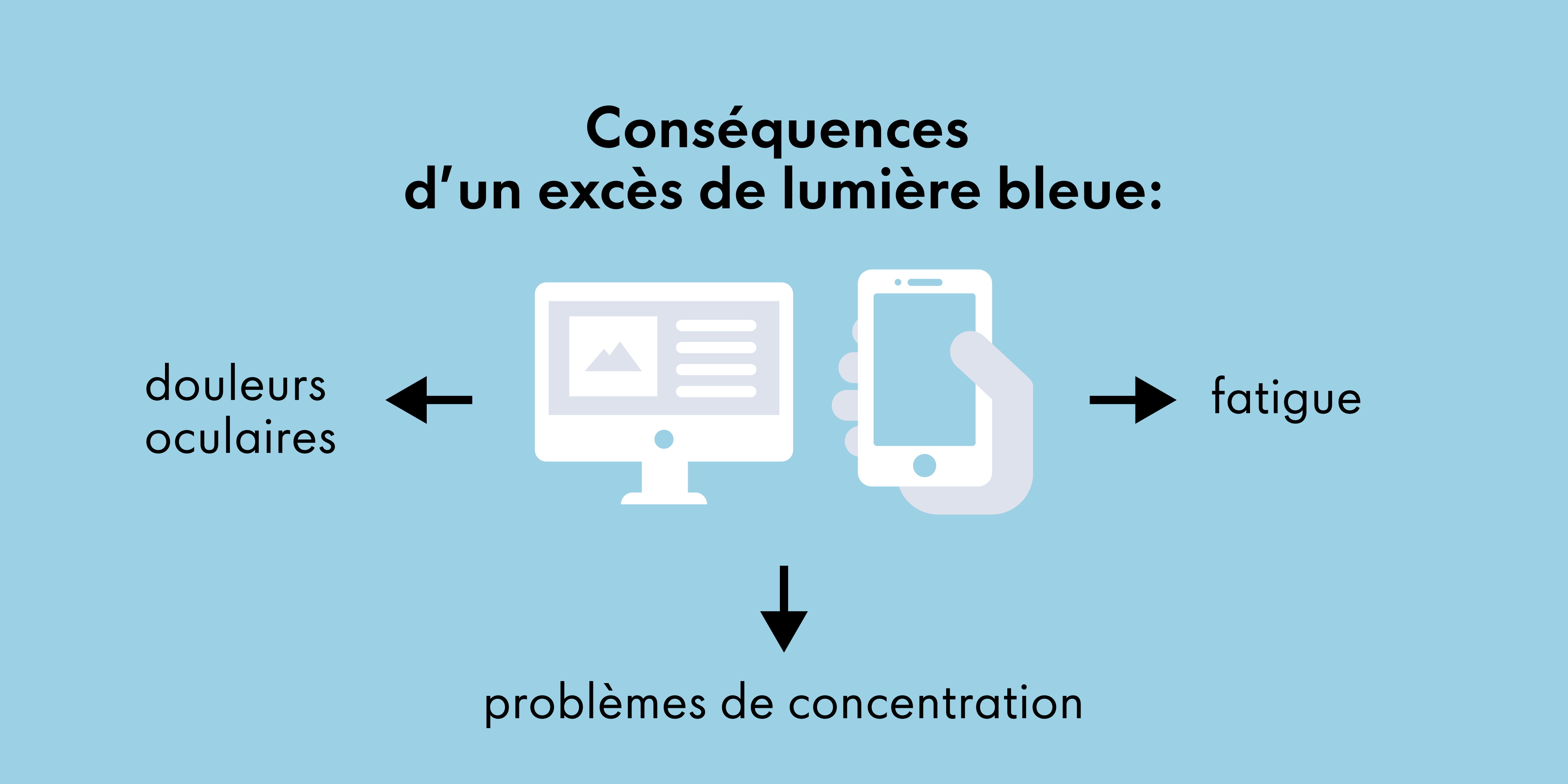 Une exposition excessive à la lumière bleue peut être dangereux pour l’œil et donner de faux signaux au corps qui influencent le rythme du sommeil et le bien-être de manière durable. Le problème est que ce n’est pas que le soleil qui émet de la lumière bleue : les appareils numériques aussi, tels que les smartphones ou les télévisions, et notre œil n’est pas capable de faire la différence entre la lumière bleue de l’écran et celle de la lumière du jour. Les LED aussi émettent une proportion élevée de lumière bleue. C’est pourquoi il est conseillé de réduire la lumière bleue au cours de la journée, surtout si vous passez beaucoup de temps devant un écran.